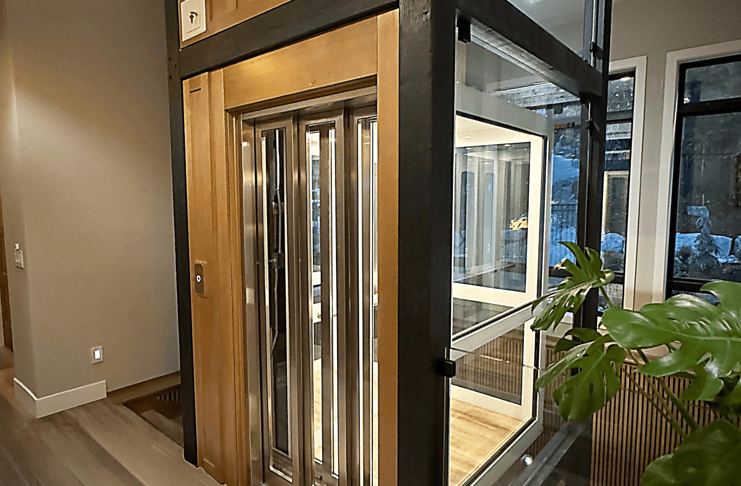 Custom all-glass — Elvoron MR elevator, seamlessly integrated into the home’s open-concept layout.